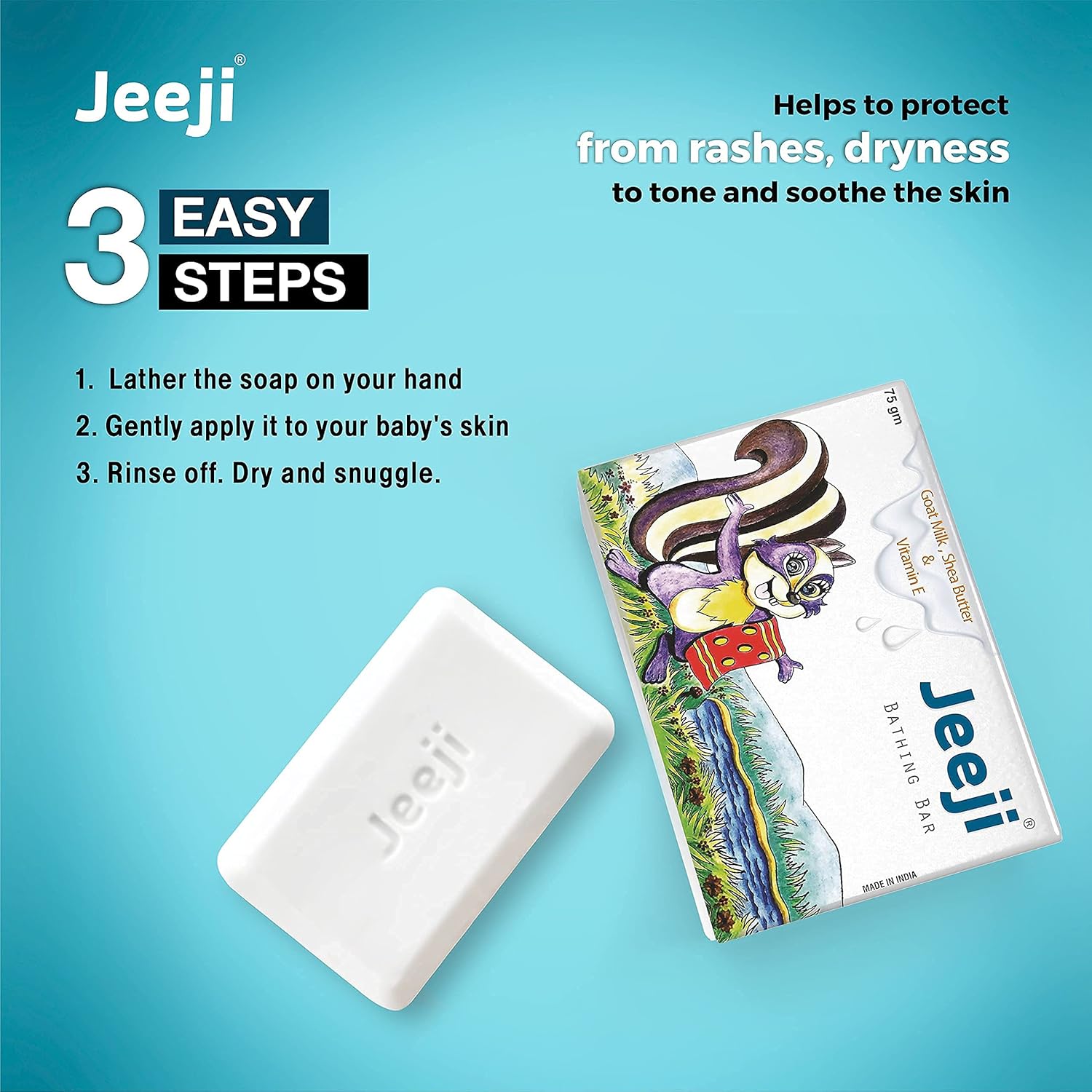 Jeeji is an advanced soap free Bathing Bar for babies and children. Its a cleanser and a moisturizer, enriched with natural ingredients like Goat milk, Shea Butter, Vitamin E, Oatmeal, Cocoa Butter, Glycerin, Olive Oil and more…which we trust as the mild properties for the young skin.
