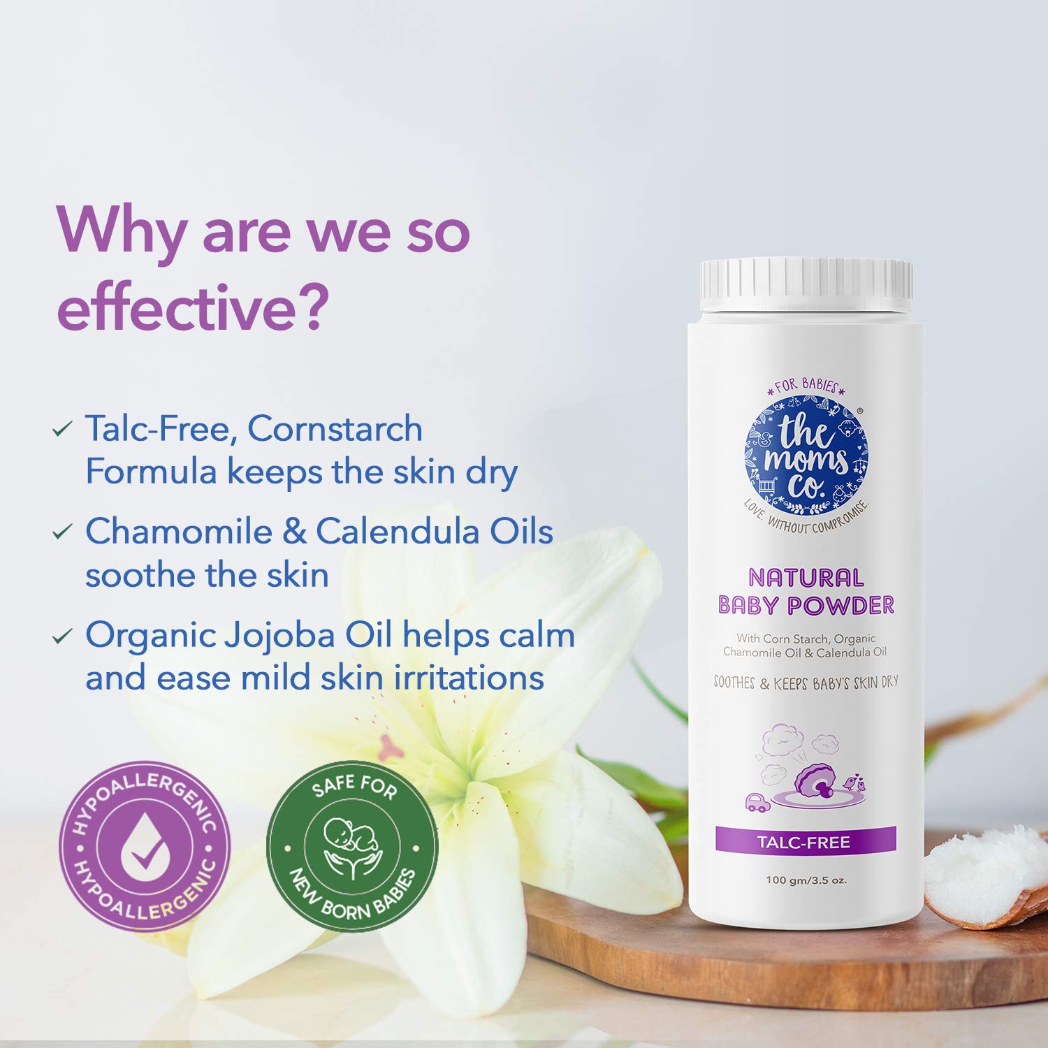 The Moms Co. Natural Baby powder is enriched with Organic Chamomile Oil which has been used as a traditional medicine for thousands of years for its calming properties, rapid wound healing, and for reducing inflammations.
