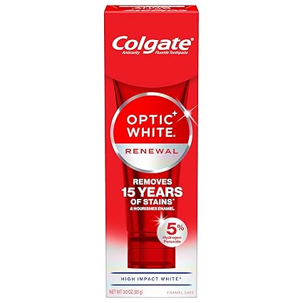 Colgate Optic White Renewal toothpaste contains 3% hydrogen peroxide, a professionally recommended whitening ingredient. Hydrogen peroxide